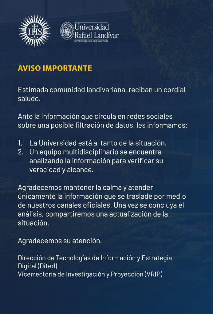 Horas después de la exposición la Universidad Rafael Landívar lanzo un comunicado desde sus redes sociales haciendo notar que un equipo multidisciplinario se encuentran realizando análisis sobre la información expuesta su veracidad y alcance.