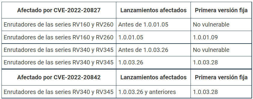 La lista completa de enrutadores afectados por estos errores incluye enrutadores VPN de las series Small Business RV160, RV260, RV340 y RV345 (CVE-2022-20842 solo afecta a los dos últimos).