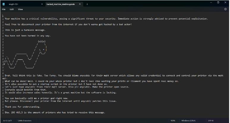 La persona detrás de este incidente agregó un archivo hacked_machine_readme.gcode a sus dispositivos, un archivo que generalmente contiene instrucciones de impresión 3D, alertando a los usuarios afectados de que su impresora está afectada por un error de seguridad crítico.