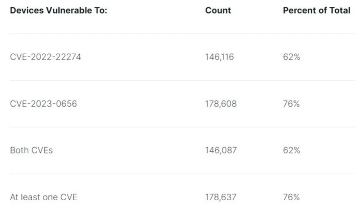 Investigadores de BishopFox utilizaron datos de BinaryEdge para escanear los firewalls SonicWall con interfaces de administración expuestas a Internet. De los 233,984 dispositivos escaneados, 178,637 se identificaron como vulnerables a uno o ambos problemas. Aunque no hay informes de explotación en la naturaleza hasta el momento, existe código de explotación disponible para la vulnerabilidad más reciente (CVE-2023-0656).
