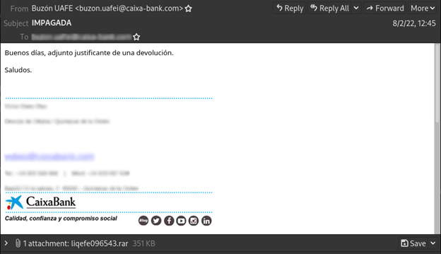 La siguiente captura de pantalla, es un claro ejemplo de esta campaña de malspam donde podemos ver el remitente y asunto mencionado anteriormente, así como un archivo adjunto incluído en el correo electrónico. En este caso, podemos ver que los atacantes se hacen pasar por CaixaBank utilizando el logo y una dirección de correo electrónico que hacen que parezca real, sin embargo, no lo es.