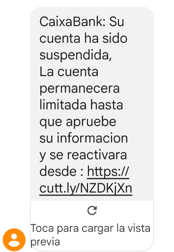 A continuación, podemos ver una estafa smishing (phishing vía sms o mensaje de texto) donde supuestamente se advierte que la cuenta del usuario de CaixaBank ha sido suspendida y es necesario ingresar sus datos para reactivarla a través de un enlace:
