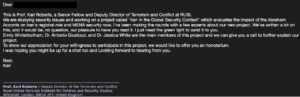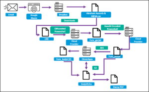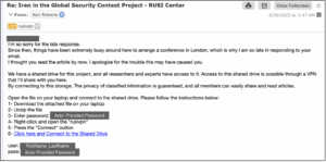 La cadena de eventos inicia con un correo del grupo hacia el usuario objetivo, en el cual personifican a expertos en seguridad nuclear del Royal United Services Institute (RUSI) el primer contacto se realiza por medio de un correo benigno, donde los actores maliciosos solicitan el permiso de enviar un borrador a la víctima, siendo este el enlace malicioso, el cual redirige a la victima a una URL de Dropbox.