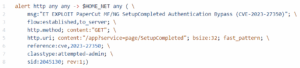 - Firma de red: La regla proporcionada por Suricata se enfoca en la detección de la vulnerabilidad como tal, dejando de lado la actividad posterior a la autentificación. Sin embargo, esta regla puede ser eludida por algún atacante haciendo uso de page//SetupCompletes o random=1&page/SetupCompleted, entre otros.