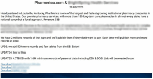 PharMerica, junto a otra farmacéutica, fueron agregadas a la lista de víctimas del grupo, a finales de marzo de 2023. Varias actualizaciones del post del grupo, indican que los delincuentes decidieron filtrar los datos robados, un total de 4,7 terabytes de información sensible.