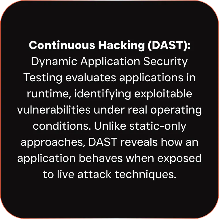 Ongoing DAST-driven application testing integrated into CI/CD pipelines to identify exploitable paths before production impact.